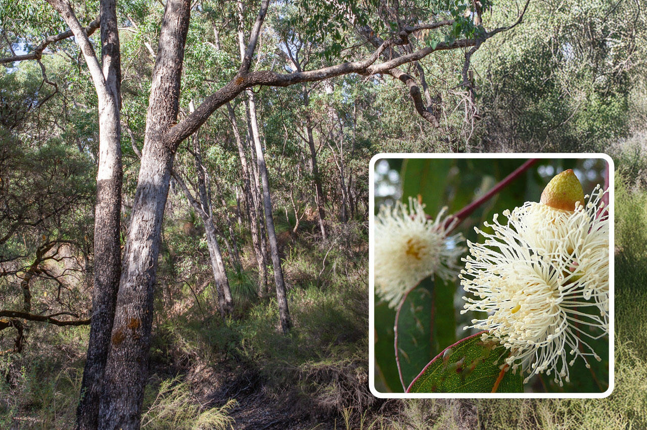 Marri (Corymbia calophylla) is a large, common tree to 60m height with characteristic large, urn-shaped fruits (known as 'honkey nuts'), and chunky, tessellated, resin-oozing bark (the tree belongs to the bloodwood group of eucalypts); Feb - Apr flowering (white) on outside of canopy.
