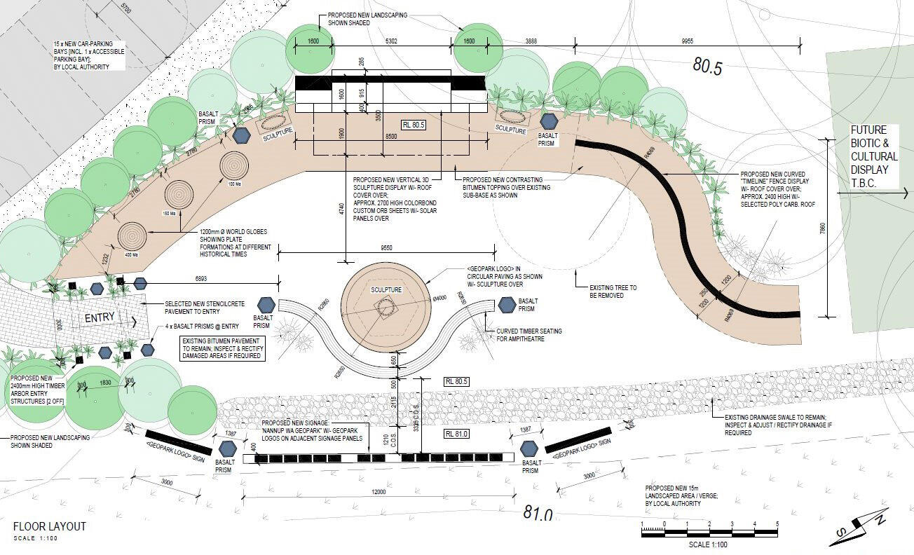 A site has had conditional development approval from the Shire of Nannup for the construction of the proposed Static Display by the Nannup WA Geopark. This display is intended as the focal point for visitors to the Geopark.Currently, all that is to be seen at this stop is the location for this exciting development. While street parking here is not suitable, you can park your vehicle nearby, either at the Nannup Recreation and Community Centre (entry via Centenary Drive 60 metres to the south of this stop) or at the Marinko Tomas Memorial (entry 160 metres to the north of this stop) where there are public toilets, picnic facilities and a playground.The following images are the initial concepts of Stage 1 prepared for Nannup WA Geopark by Paul Meschiati and Associates.