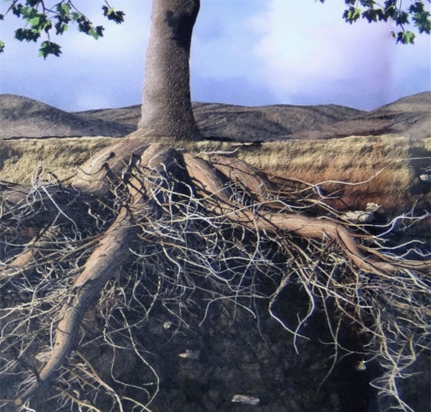 For the SCEA field activity, the term “estimation” rather than “measurement” is used so as to not imply a high degree of accuracy when root-hosted carbon is included in the calculation. SCEA uses a root carbon ratio of 0.3 of the above-ground carbon held by the trunk and branches.The illustration below shows the below-ground root system and the above-ground trunk of a tree.