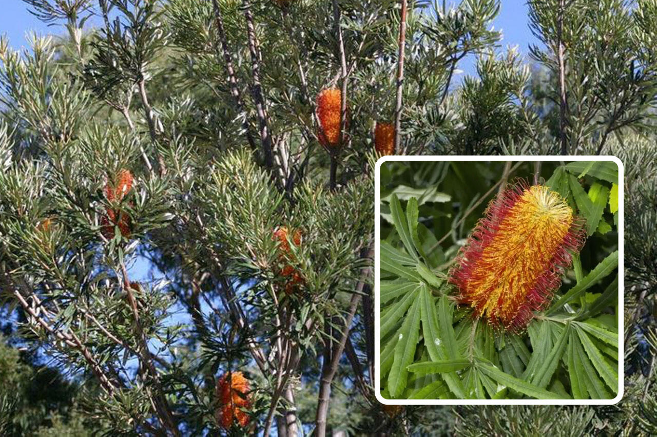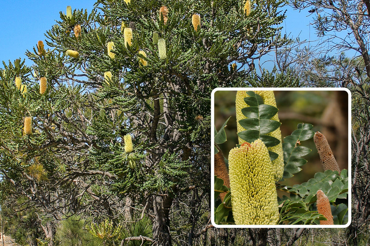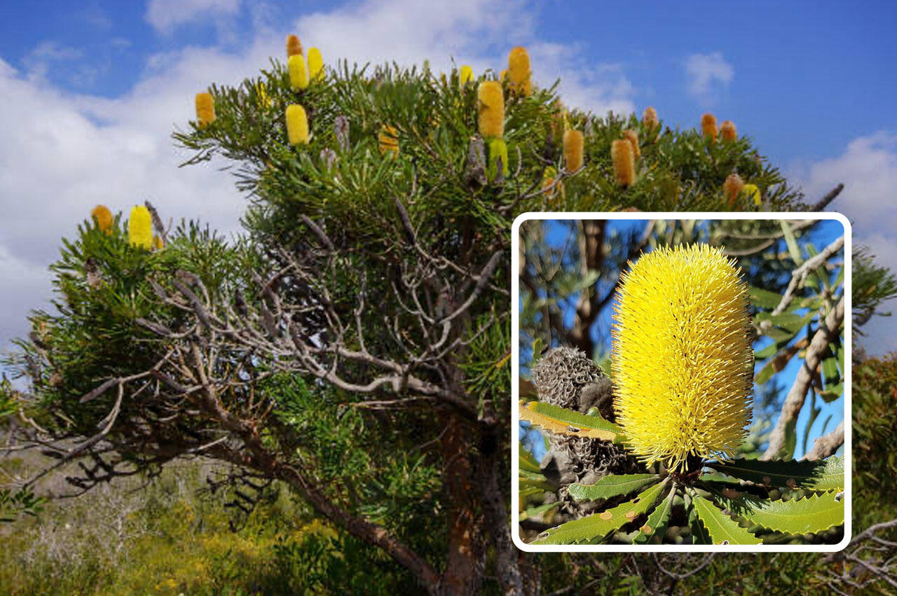 River banksia (Banksia seminuda) grows to 20m height, usually with a straight trunk and tough, fissured grey bark, and as the name suggests, along watercourses in jarrah, marri and karri forests. Its leaves are leathery and finely serrated; Mar - Aug flowering.