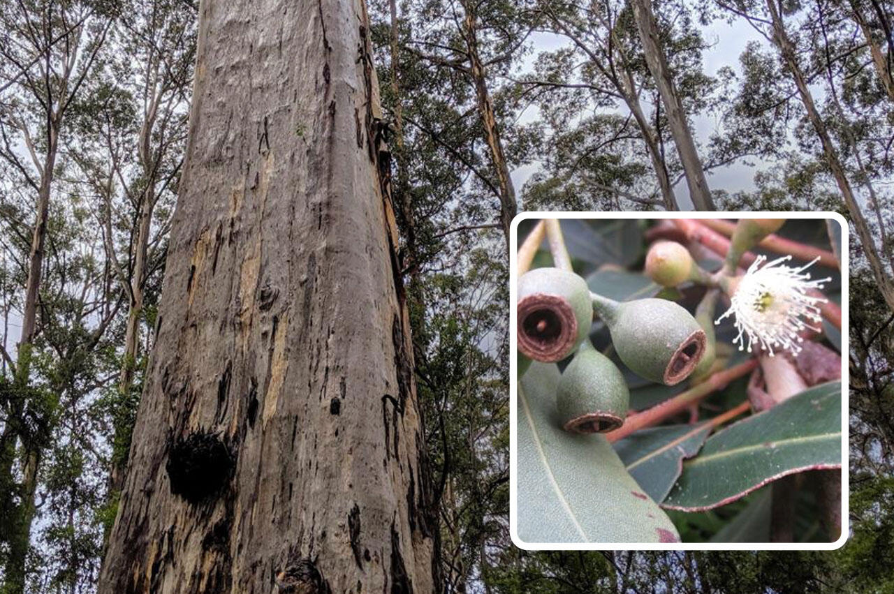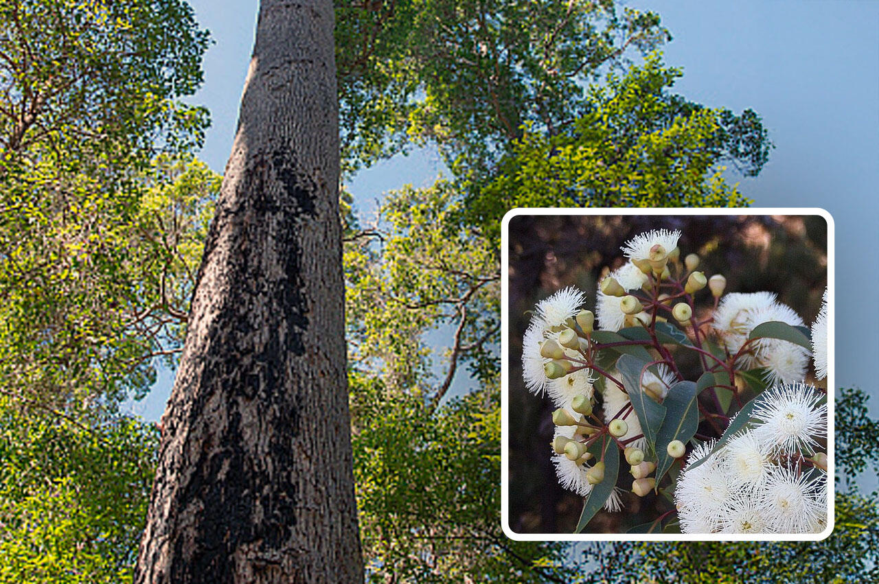 Karri (Eucalyptus diversicolor) is a very tall tree to 90m height, has smooth, pale grey and cream bark which peels off in long sheets accumulating at the tree base; Sep - Feb flowering (white).