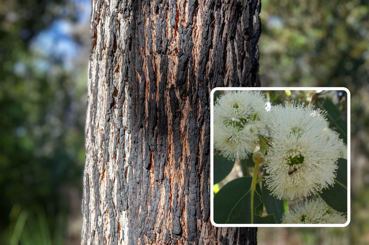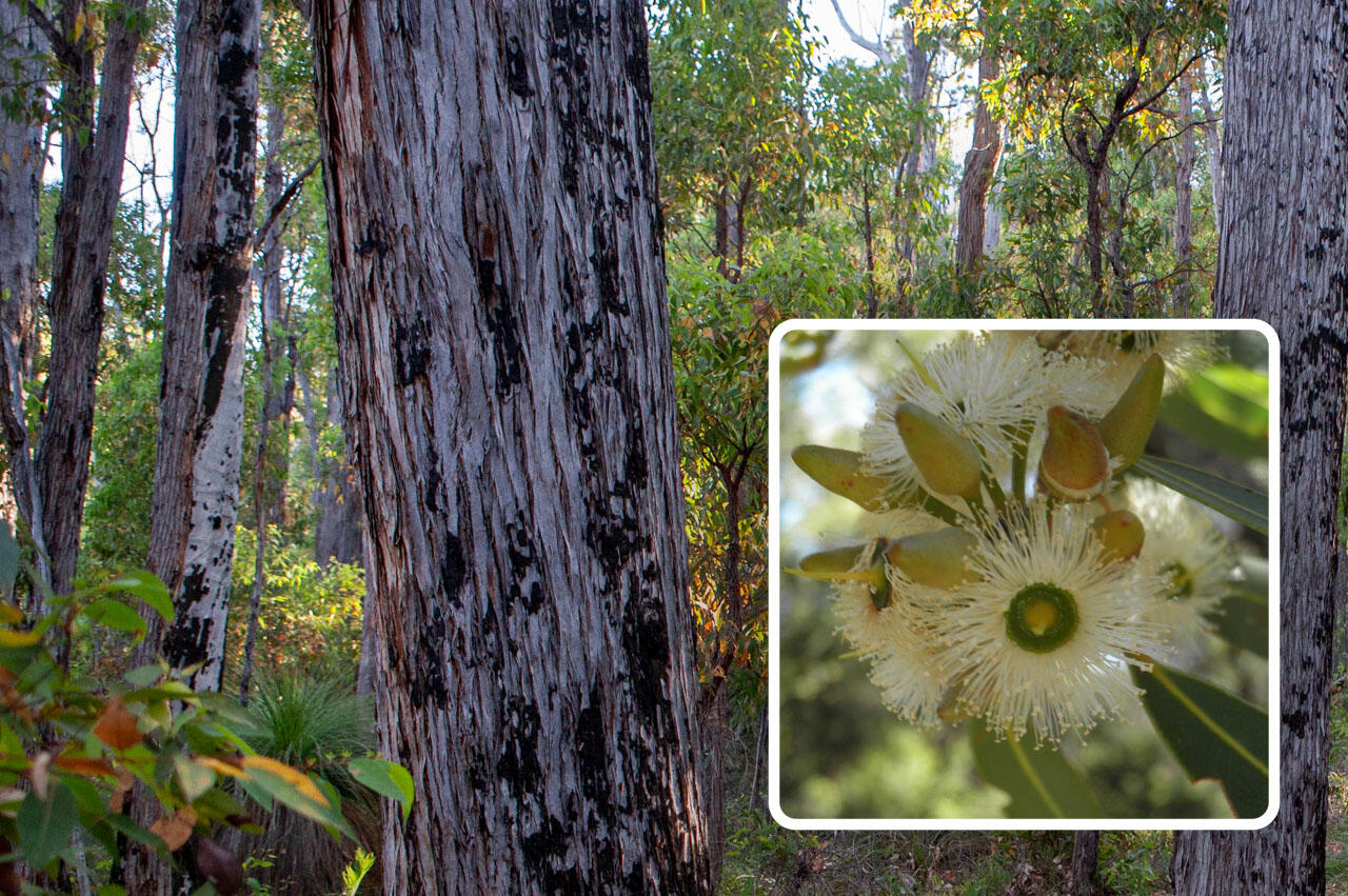 Flooded Gum or River Gum (Eucalyptus rudis) medium-size tree to 20m height with rough, grey bark on the trunk and smooth, grey bark on branches.; Jun - Sep flowering (white).