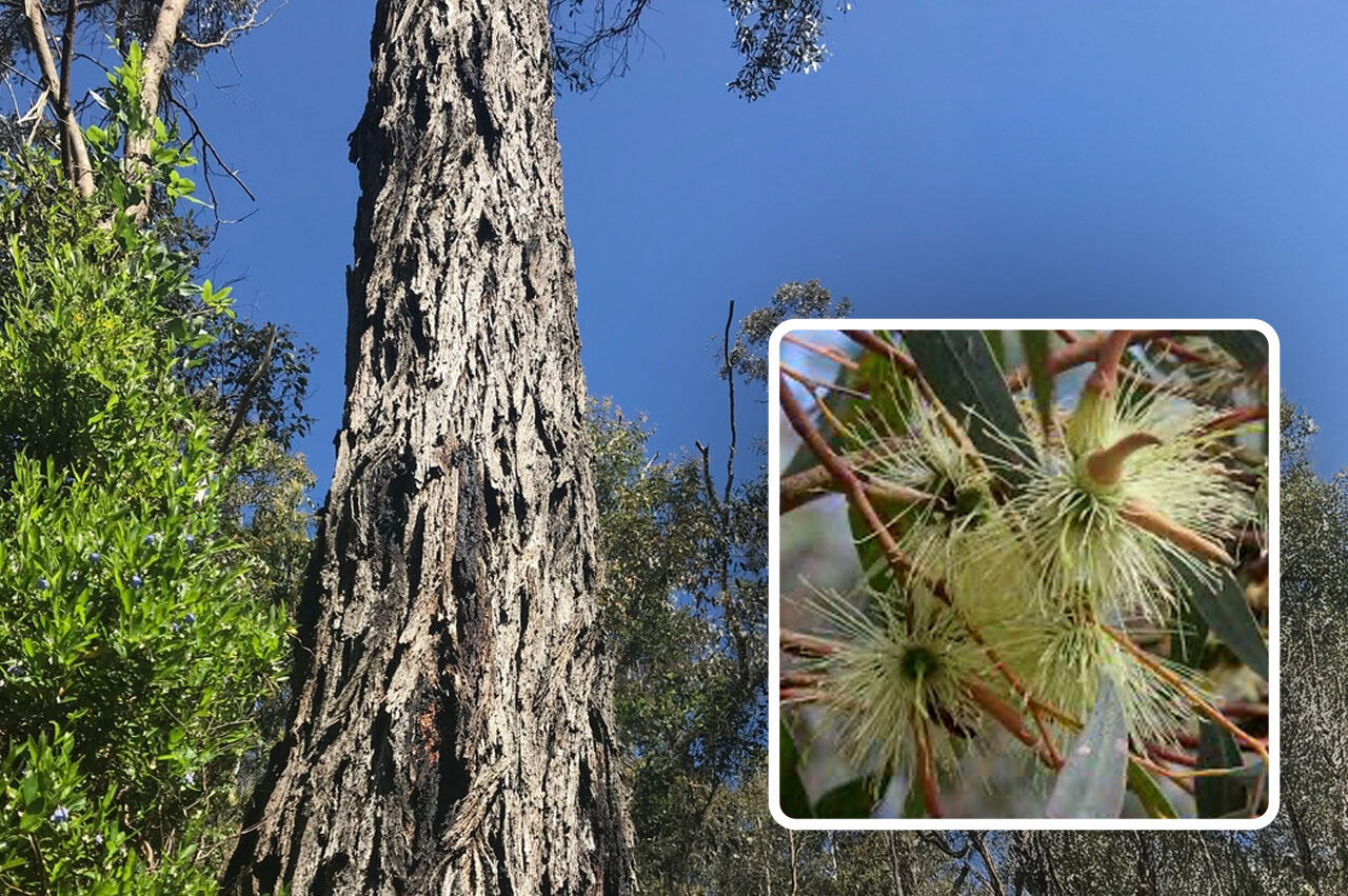 Marri (Corymbia calophylla) is a large, common tree to 60m height with characteristic large, urn-shaped fruits (known as 'honkey nuts'), and chunky, tessellated, resin-oozing bark (the tree belongs to the bloodwood group of eucalypts); Feb - Apr flowering (white) on outside of canopy.
