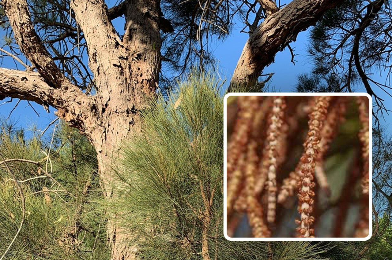 Sheoak (Allocasuarina fraseriana) is common in jarrah forest and eucalypt - banksia woodlands. It is a small to medium size tree to 15m height with rough, fibrous bark and green, needle-like, segmented leaves which are actually branchlets; the leaves being tiny triangular 'teeth' at one end of each segment. The female tree produces rough, woody bracts/cones, often seen on the ground below the tree; Apr - Sep flowering by the male tree (profusion of tiny rusty brown flowers).