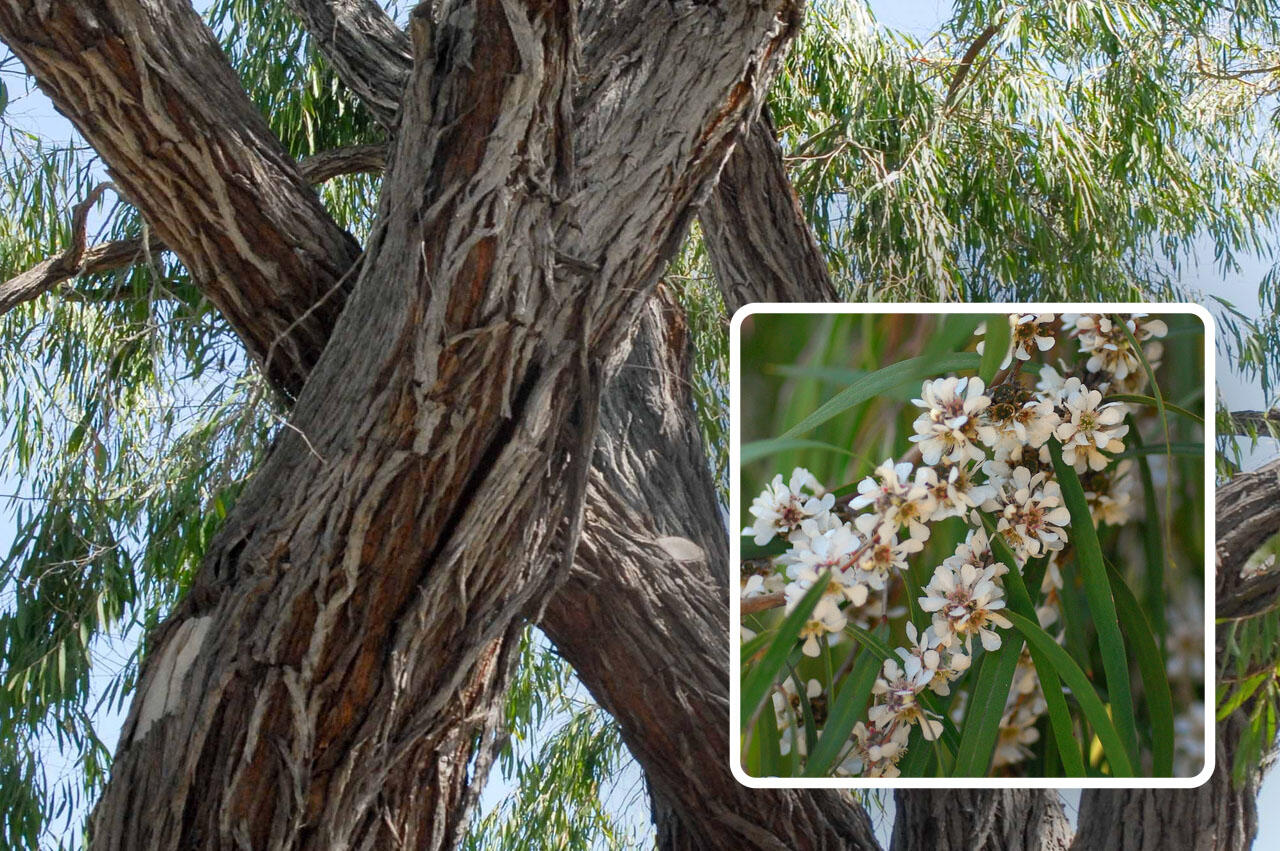 Peppermint (Agonis flexuosa) is a small to medium-size tree to 10m height with weeping branches and narrow, pendulous leaves (strongly aromatic when crushed); Sep - Feb flowering (white).