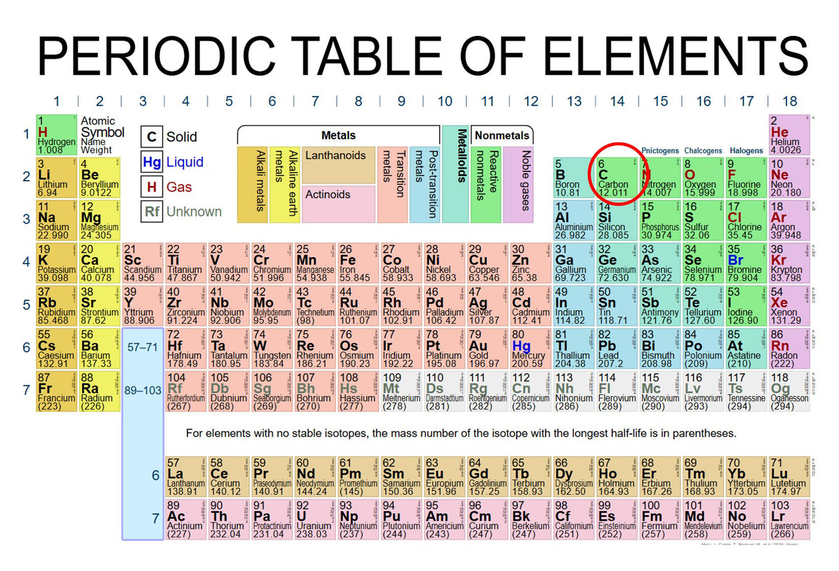 Carbon is a non-metal, number 6 on the Periodic Table in the second row, together with other reactive non-metals such as oxygen (O) and nitrogen (N). See Periodic Table below.